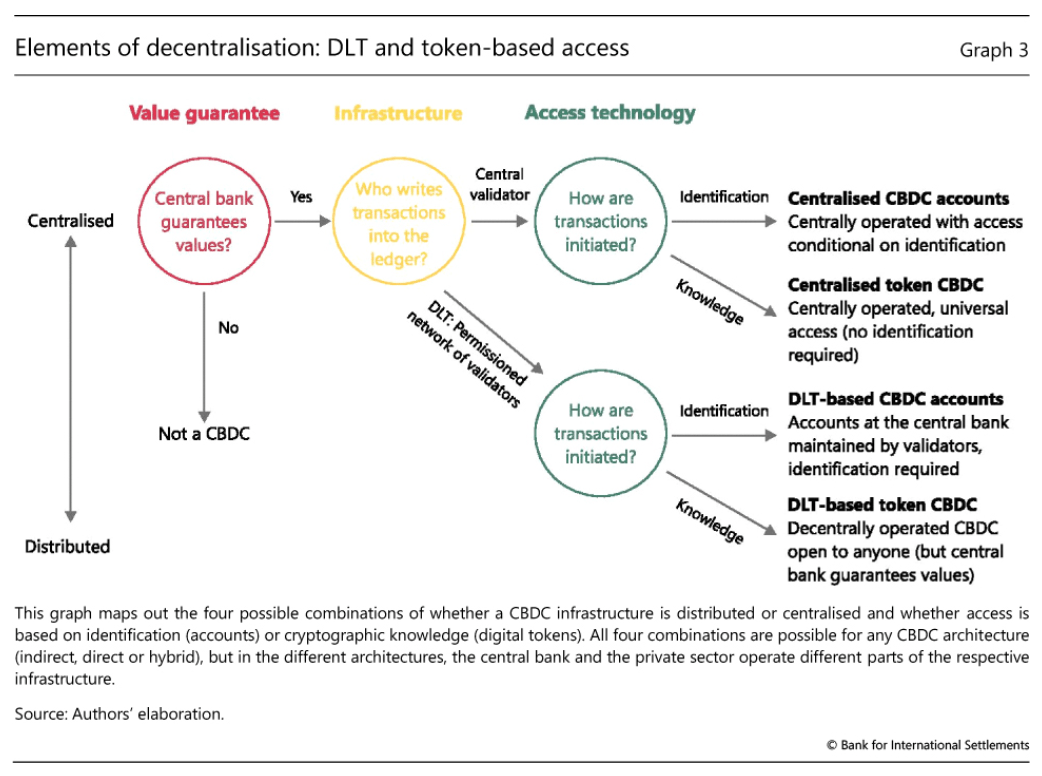 According to the Bank for International Settlements, there are four basic designs for a central bank digital currency. Two questions must be answered by the CBDC developer: