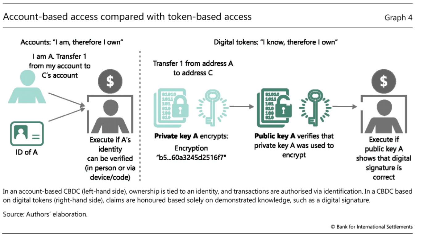 A token-based system works similarly to Bitcoin. A person owns their CBDC inside their wallet, because they control their private key. A person could create multiple “accounts” (wallets) by generating a new private key without needing a government-issued ID. In this model, the CBDC retains the peer-to-peer cash characteristics.