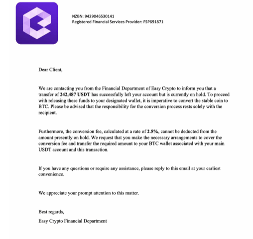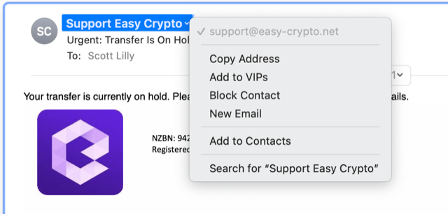 Below is another example of a phising attempt, where a scammer is impersonating Easy Crypto.