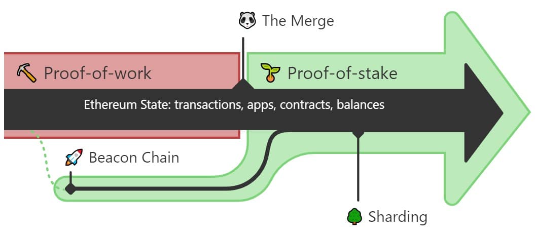 What we see now as Ethereum is the blockchain layer that handles data and transactions, now still coupled with the Proof of Work mining mechanism, but will later be deprecated.