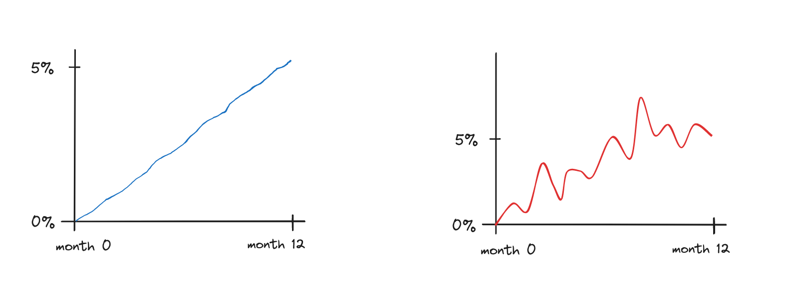 One is clearly more volatile than the other, even if both reach the same price change of 5% at the end of the year. If you see yourself as more risk-averse, you’d probably prefer the first one.