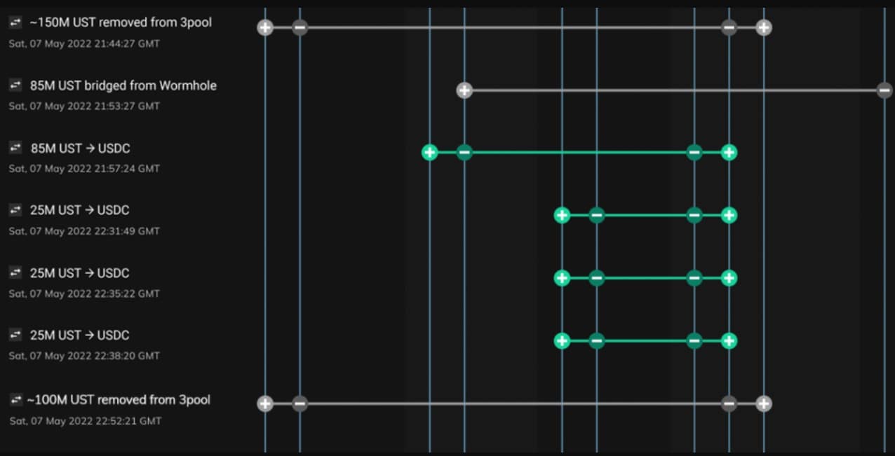 On 7 May, Do Kwon’s Terraform Labs withdrew 150 million UST from Curve’s 3pool liquidity pool as part of a planned and public operation. Removing so much asset value from an otherwise deep liquidity pool makes prices of UST in that pool more volatile.