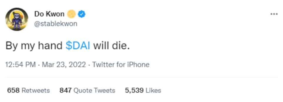 On 23 March, Do Kwon tweeted “By my hand DAI will die“, also a reaction to a claim that UST/LUNA is a Ponzi scheme, this time by Maker DAO’s cofounder. Do Kwon then publicly announced that he would be deploying a liquidity pool (decentralised swap protocol) called 4pool.
