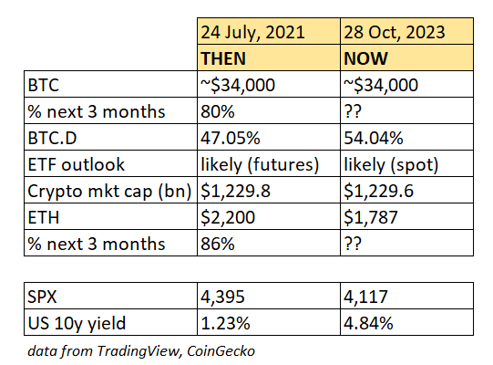 Yields on US treasuries broke above 5% briefly, and oil prices are drifting higher as there are signs of regional expansion in the Gaza – Israel war. Tellingly, US equities are down ~10% since the Gaza situation blew up, Bitcoin on the other hand + 27%.