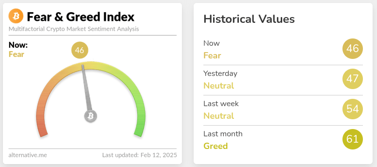 Market sentiment has fallen significantly in the last week and now sits at neutral, leaning slightly to fear.