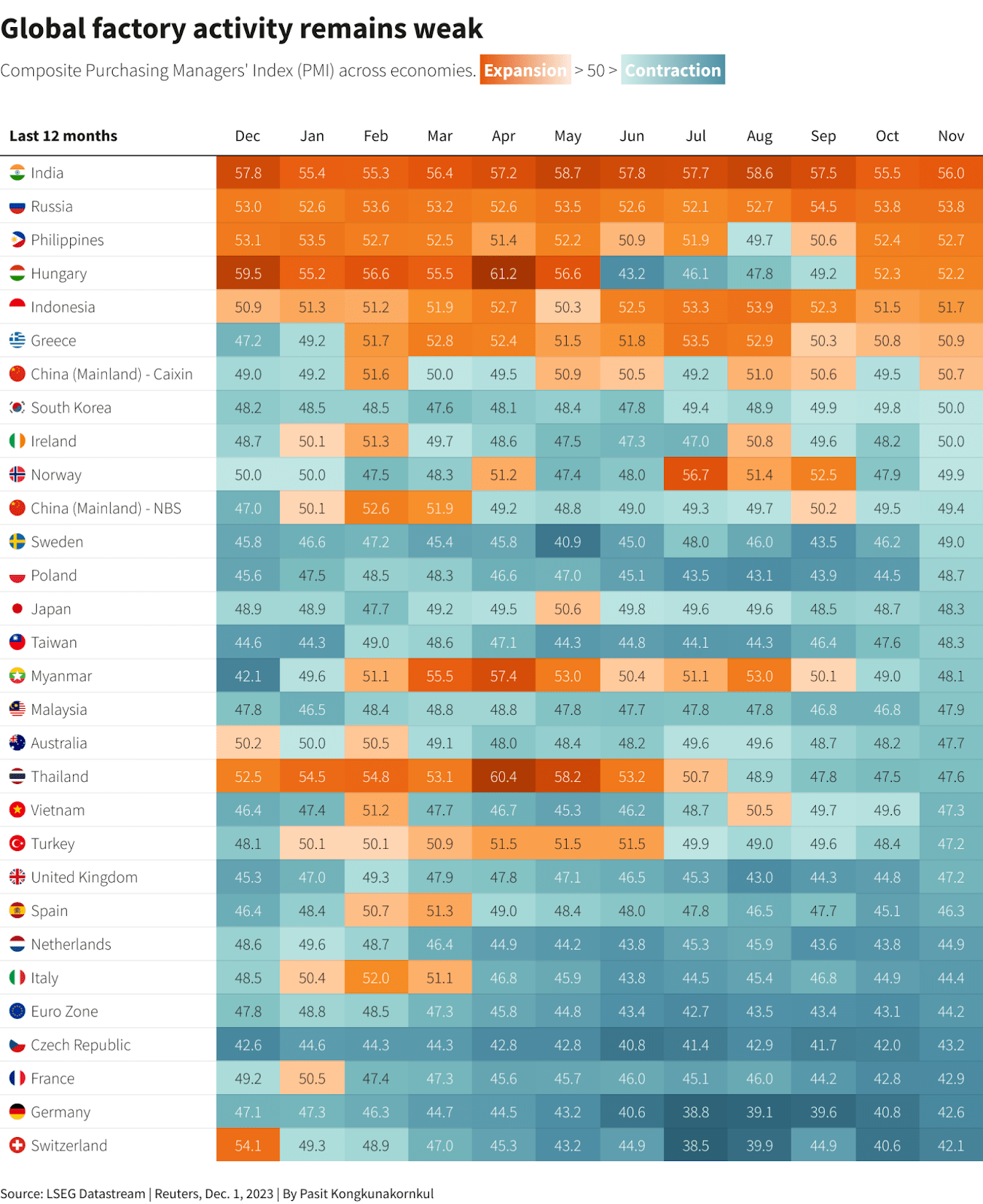 It is PMI week across Asia with most economies putting out numbers. The consistent trend is PMI is still in contraction at around 47, but it has improved since October. This is true for Japan, Philippines, Indonesia, South Korea and Malaysia. India is a clear outlier, posting a PMI of 56, up from 55 in October.