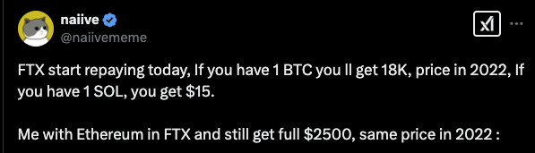 FTX is starting to make repayments to creditors with some $1.2bn being dispersed. The assets are valued at 2022 prices. Which sucks for BTC but is just fine if you had ETH on the platform…Crypto Twitter is taking it well.