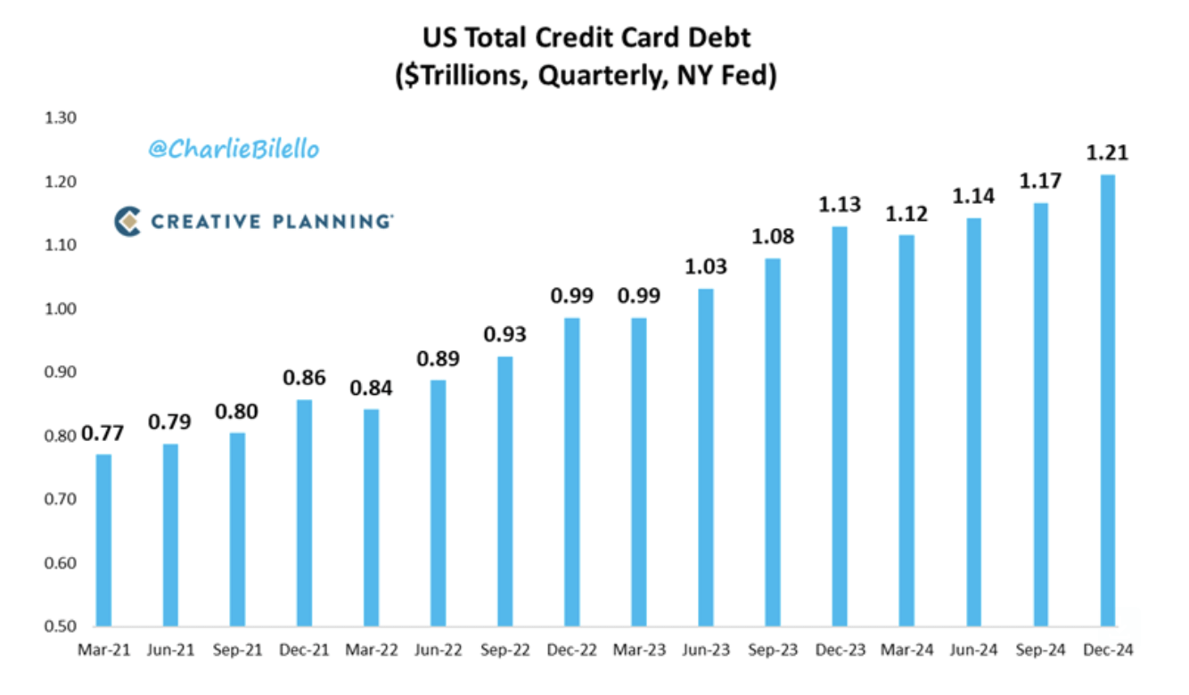 Cracks are starting to grow as U.S. consumer spending fell for the first time in two years in January, and US Credit Card debt hit a record $1.2 trillion in Q4 2024, rising +7% over the last year.