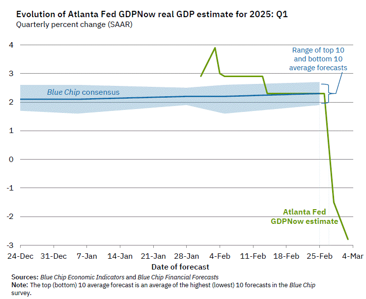 The US 10-year Treasury yield passed below the 3-month note in trading last week – known as an “inverted yield curve” and an ominous measure that the Federal Reserve considers a near surefire recession signal. The Atlanta Fed also published an updated GDP model predicting -1.5% growth in Q1.