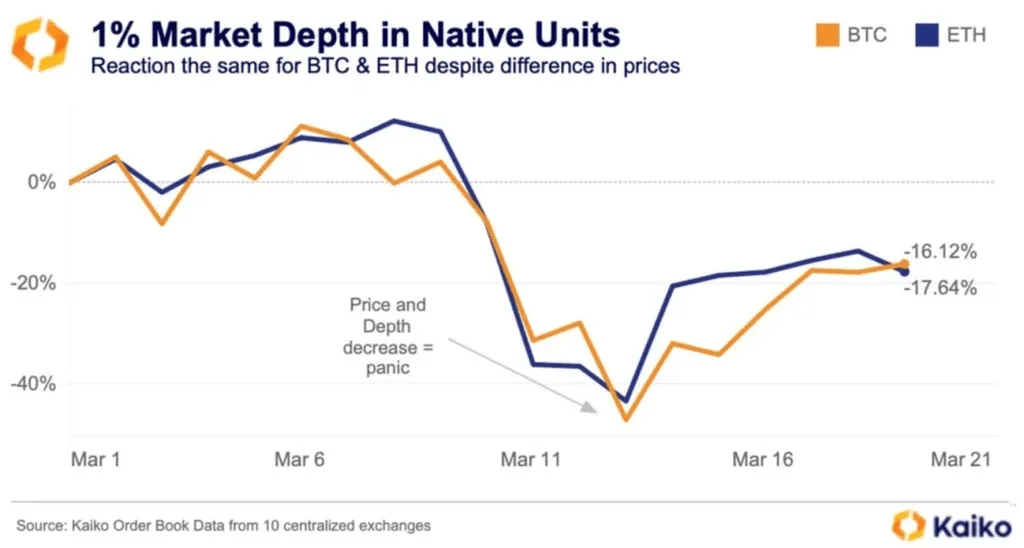 BTC and ETH liquidity levels have dropped since the beginning of March due mainly to the US banking shutdowns. Less liquidity means more order slippage and higher spreads. It can also mean more volatility so gear up!