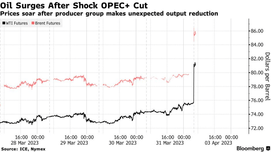 OPEC+ announced a surprise cut to oil production starting from May. This is designed to ‘provide market stability’ to oil producers, but will ultimately be inflationary for oil importers. It also appears to be a signal from the Saudis to the US.