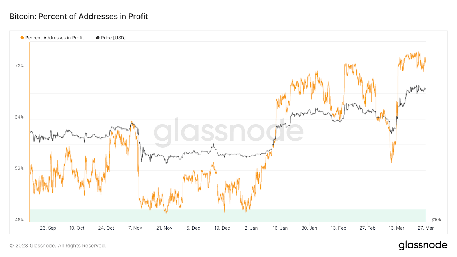 Glassnode analysis shows that there’s been a big uptick in BTC addresses that are in profit this year.