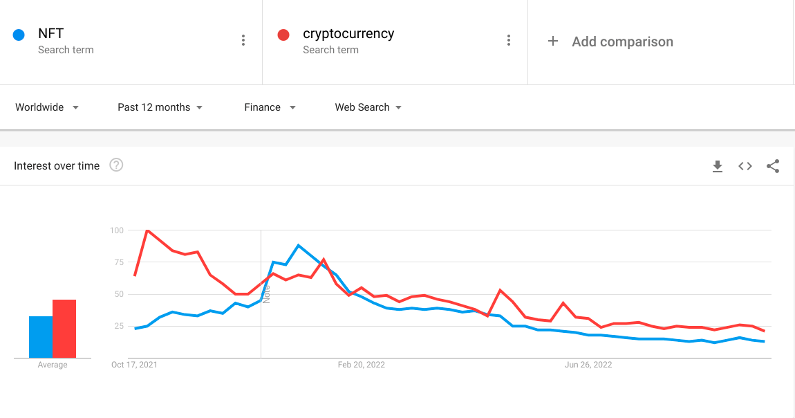 If you look at Google Trends, search for NFT and cryptocurrency. You’ll see how volatile the graphs are. Although we can’t assume this as the real condition, we can still take a look at it to see what it tells us.