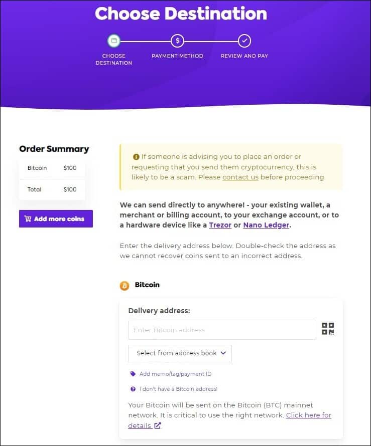 This step is crucial as it asks you to write down your delivery address. Bitcoin wallet addresses are typically long, you need to be careful and make sure to copy-paste the address to avoid mistyping it. If your wallet offers a QR code of the address, you can click on the four square logo to allow your browsing device to scan your wallet’s QR code if possible.