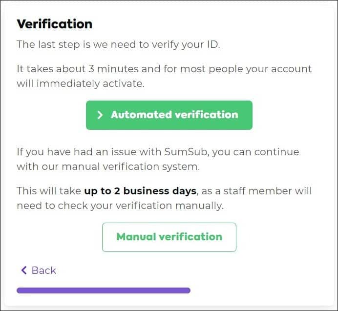 Then what you should do next is go to My Account, click Verify > Verify basic details. You will be greeted with this page. As you’ll see, there are two ways you can verify your ID — using automated verification with SumSub or manual verification, which takes a little bit longer as a staff member will need to check your documents.