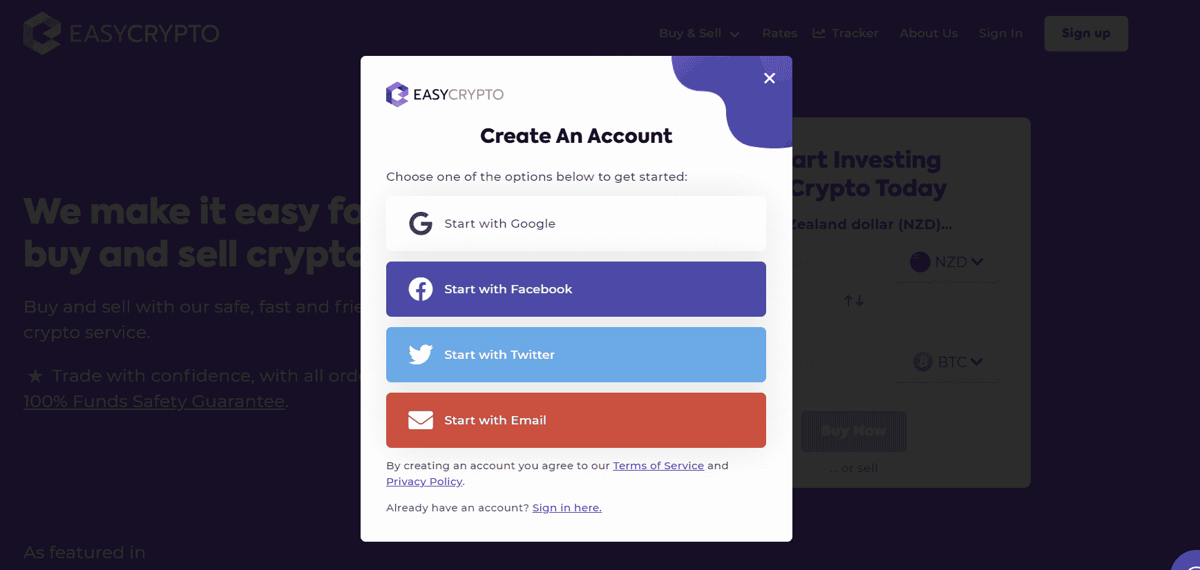 Creating an account with Easy Crypto takes a few seconds if you use your Google, Facebook, or Twitter account to do a one-click sign up. Alternatively, you can use your own email address. Go to our main website and click on Sign Up.