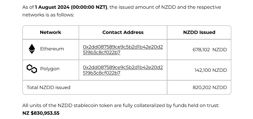 As you can see, there is at least $820,202 backing 820,202 units of NZDD, making it fully collateralised, and thus stable.