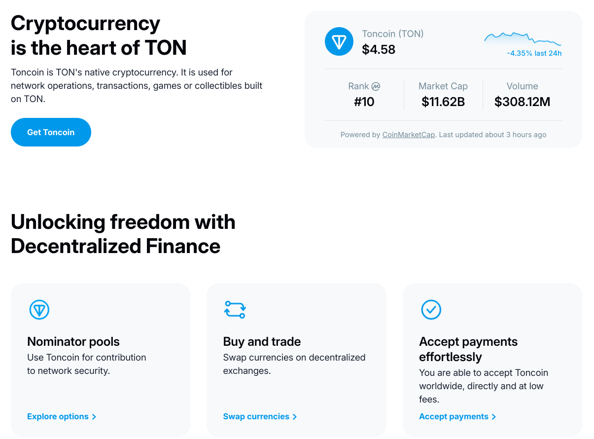 - Payment Gateway: Toncoin acts as a universal payment method within the TON ecosystem, enabling seamless transactions across various dApps and services.